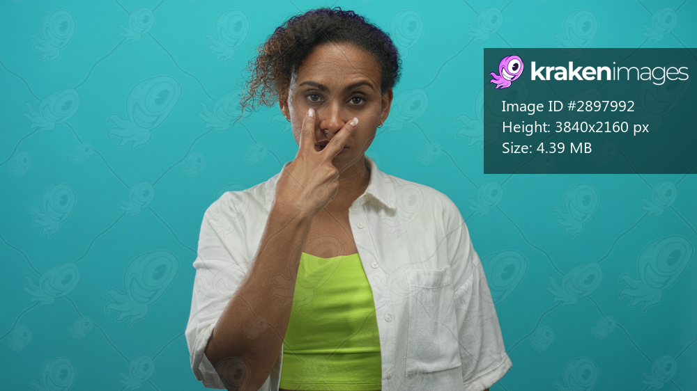Woman points finger forward in teal studio wearing white shirt and neon green layer; confidence authority.