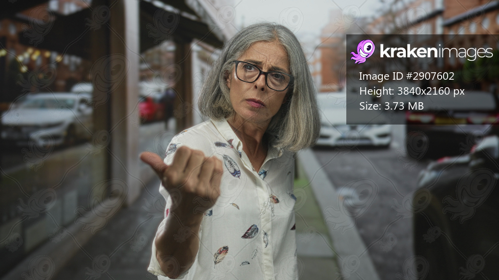 Woman points finger forward on street wearing glasses and patterned blouse with stern expression; anger.