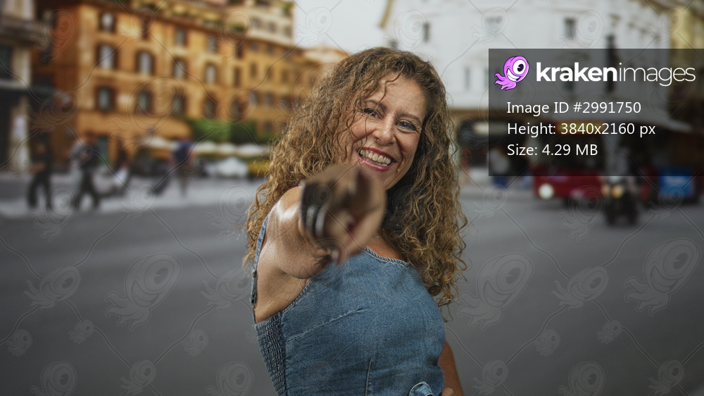 Woman points finger forward and smiles in denim dress by a red city bus on a street, curly hair visible; joy confidence.