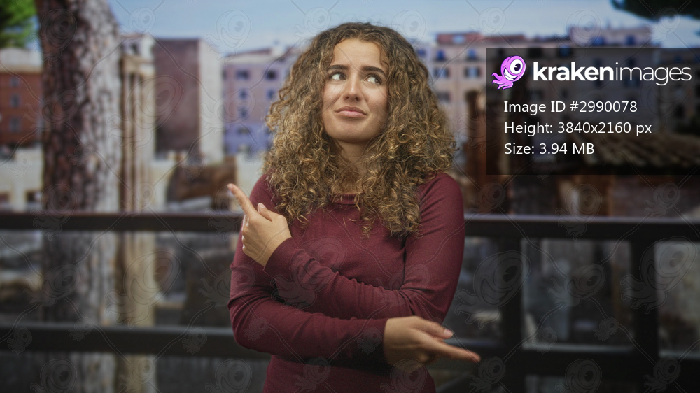 Woman points finger with hands near torso on building balcony, curly hair and closed eyes showing a puzzled gesture; uncertainty reflection.