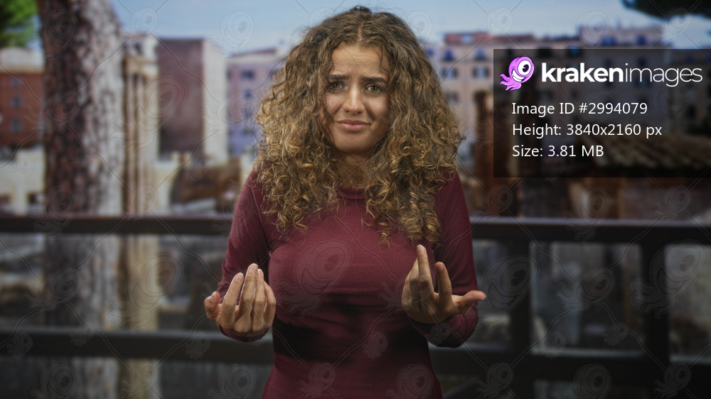 Woman points finger with hands near torso on building balcony, curly hair and closed eyes showing a puzzled gesture; uncertainty reflection.