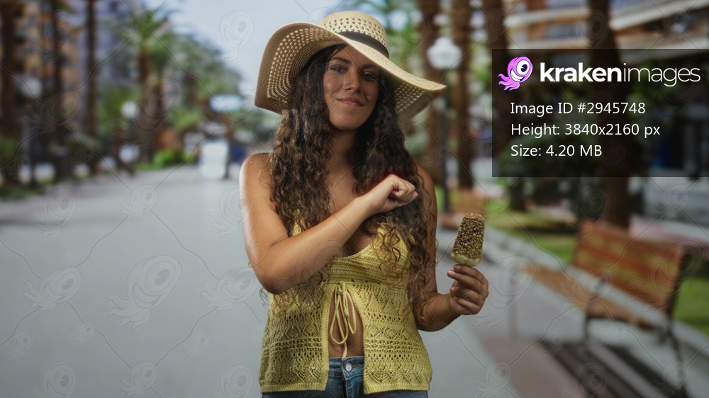 Woman points finger holding a popsicle on a street promenade, wearing a sunhat and yellow crochet top with jeans; playful confidence.