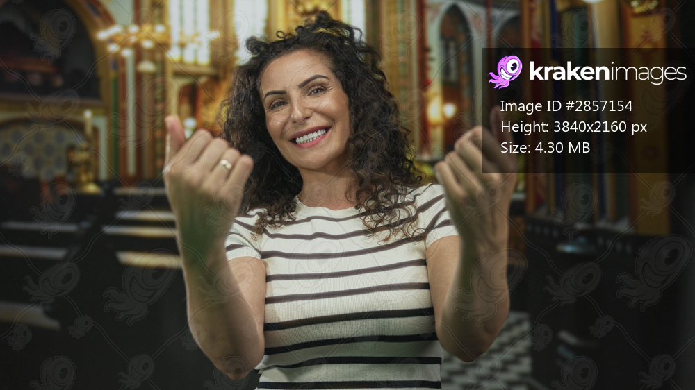 Woman points finger in church sanctuary with candlelit altar, mosaic tile floor, and ornate columns; joy invitation.