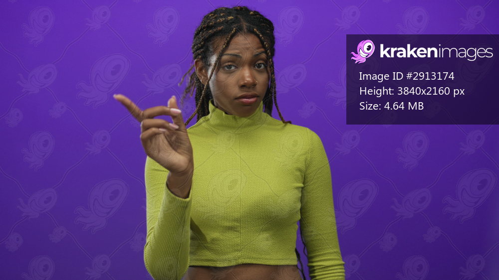 Woman points finger in purple studio while wearing lime cropped top and showing midriff; disapproval dismissal.