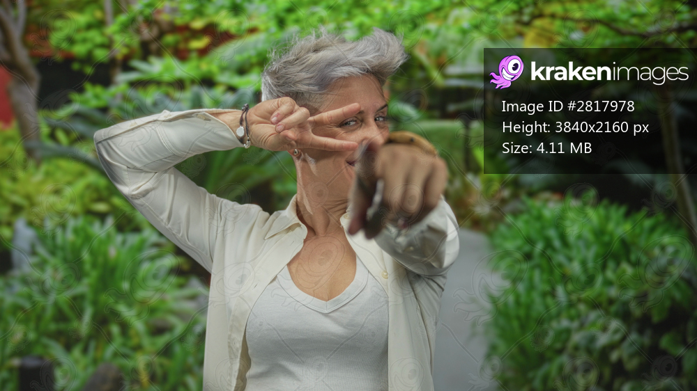 Woman points finger in studio with green plants behind her wearing white tank top and open shirt while smiling at camera; confidence pride joy energy.