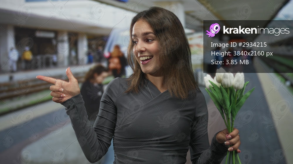 Woman points finger with left hand while holding a bouquet of white tulips at a street station platform; happiness travel hope.
