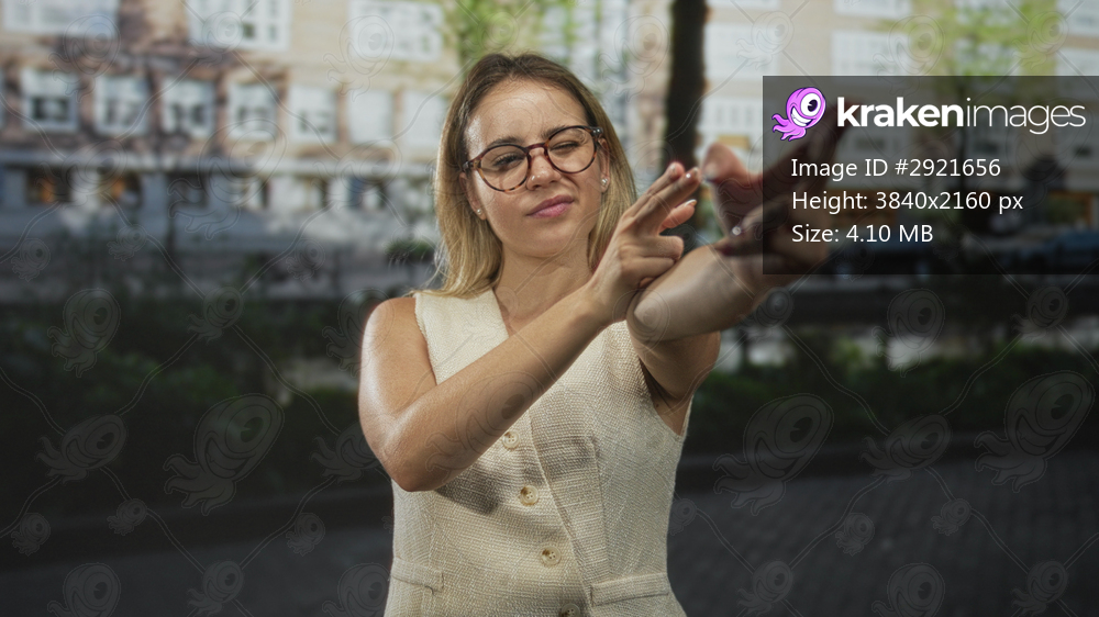 Woman points finger like gun on street in amsterdam with glasses and bare arms visible; playful confidence.