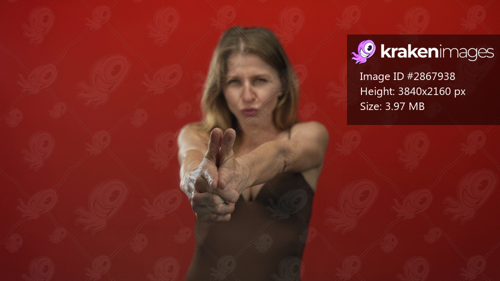 Woman points finger like gun wearing brown bodysuit with visible cleavage and bare shoulders in a red studio; confidence.