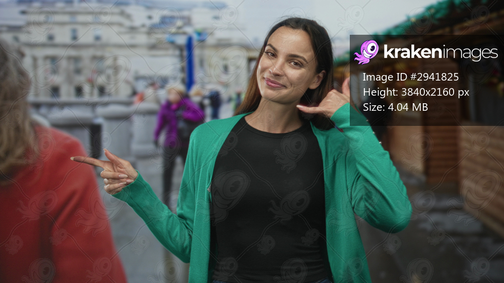 Woman points finger and makes call me hand sign in front of wooden market stalls on street, smiling with eyes closed; playful casual greeting.