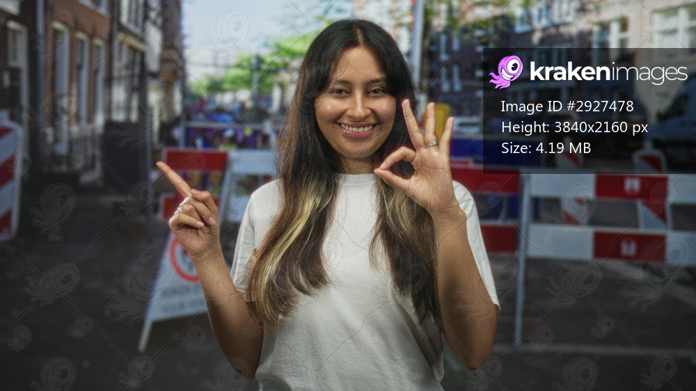 Woman points finger and makes ok sign on street near construction barricade while smiling and looking sideways; friendly confidence.