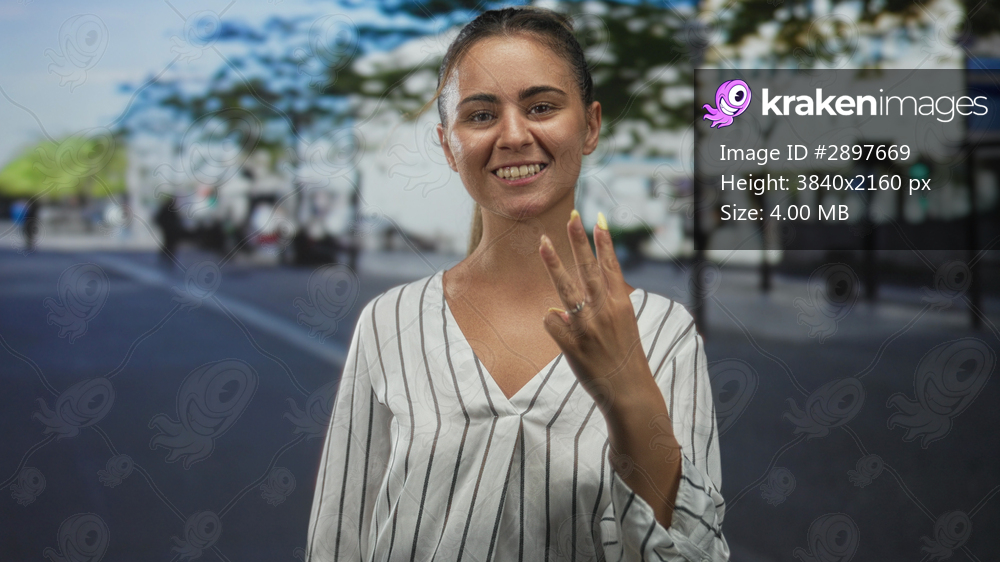 Woman points finger and makes peace sign on city street wearing striped blouse, hands visible and facing camera; confidence.