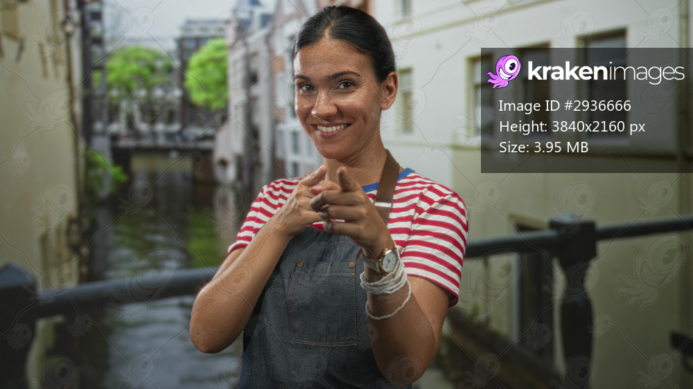 Woman points finger near canal bridge on street in amsterdam wearing apron and red striped shirt; confidence.