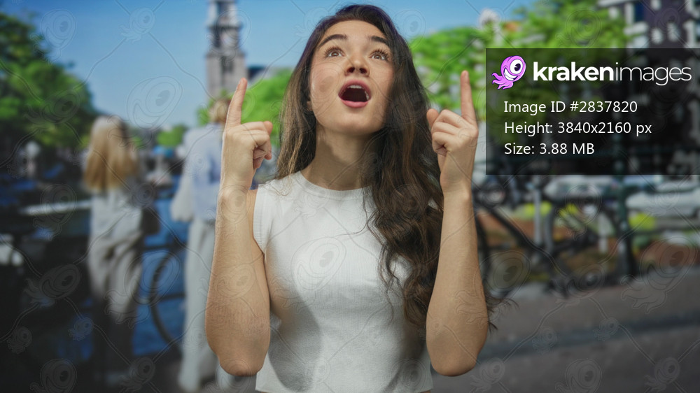 Woman points finger on busy city street at passing cyclist with visible scowl and pursed lips; disapproval.
