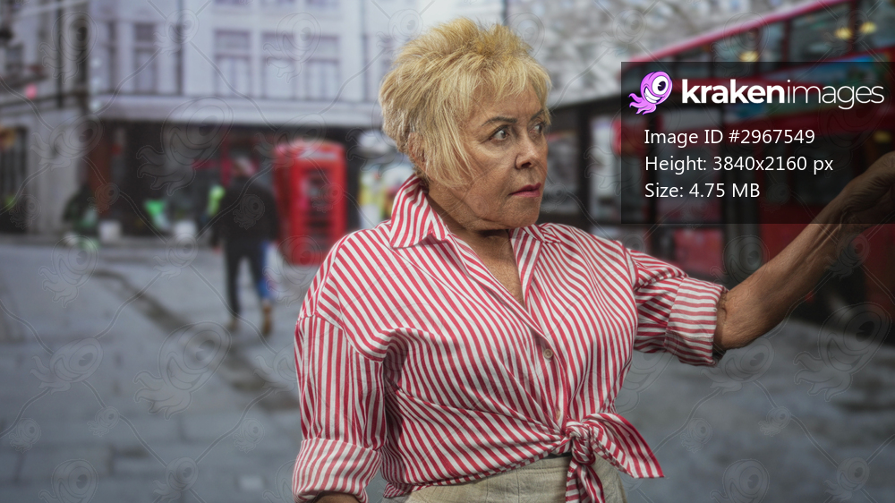 Woman points finger on busy london street by red bus and phone box, striped shirt visible, hand raised and gaze directed forward; assertive concern.