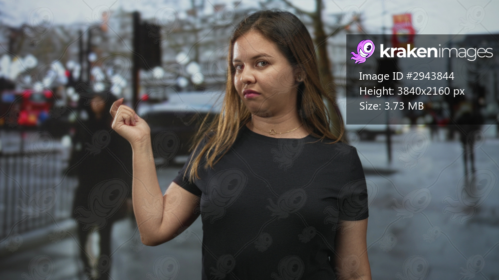 Woman points finger on city street wearing black tshirt and necklace with hand raised and visible index finger in a blurred urban street scene; urban annoyance. - Kraken Images