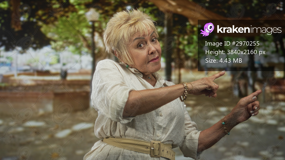 Woman points finger on street near park trees and bench, hands extended showing bracelets, belt and earrings while gazing sideways; assertive confidence. - Kraken Images