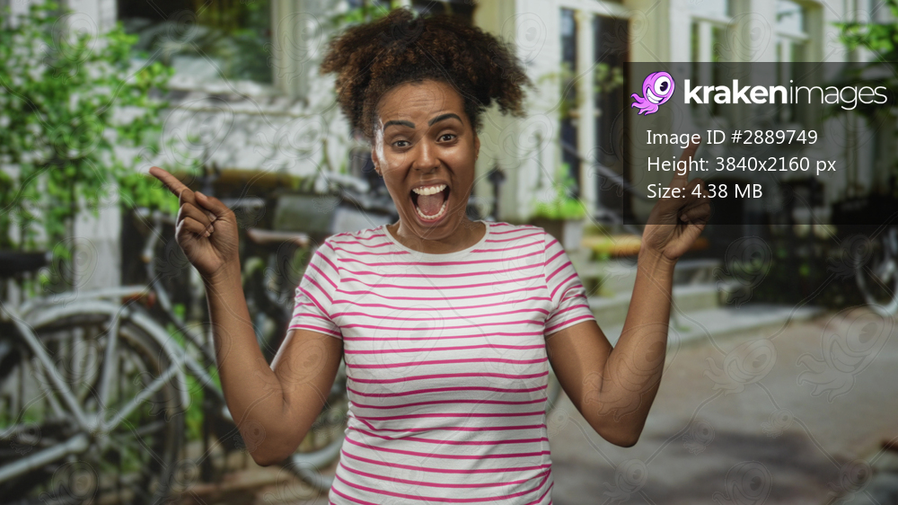 Woman points finger on street near parked bicycles and building while smiling with open mouth; promotion excitement.