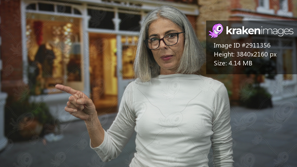 Woman points finger on street storefront, hand extended and face visible wearing glasses and white top; instruction focus.