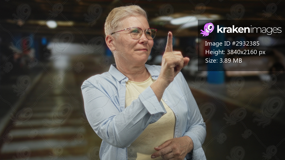 Woman points finger with open palm inside parking building while smiling and wearing glasses and light shirt; friendly optimism.