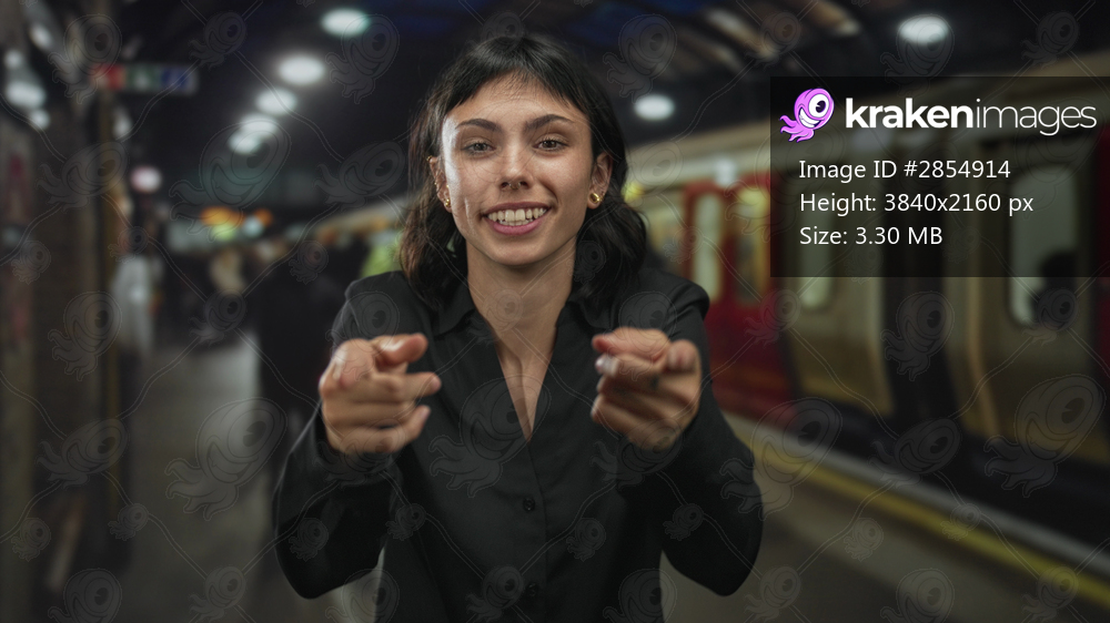 Woman points finger with outstretched arms at crowded indoor train station platform; curiosity connection.