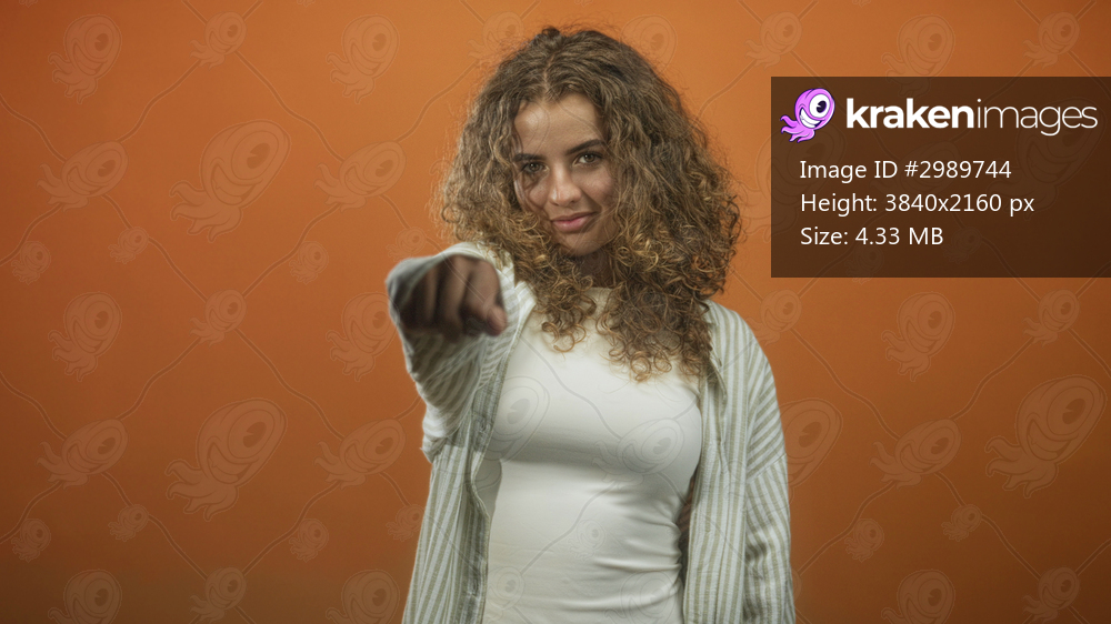 Woman points finger with outstretched hand directly at camera in studio, curly hair and white shirt visible; confidence.