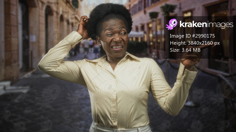 Woman points finger and scratches head on a narrow cobbled street lined with shops and storefronts, framed by blurred pedestrians and buildings; confusion hesitation. - Kraken Images