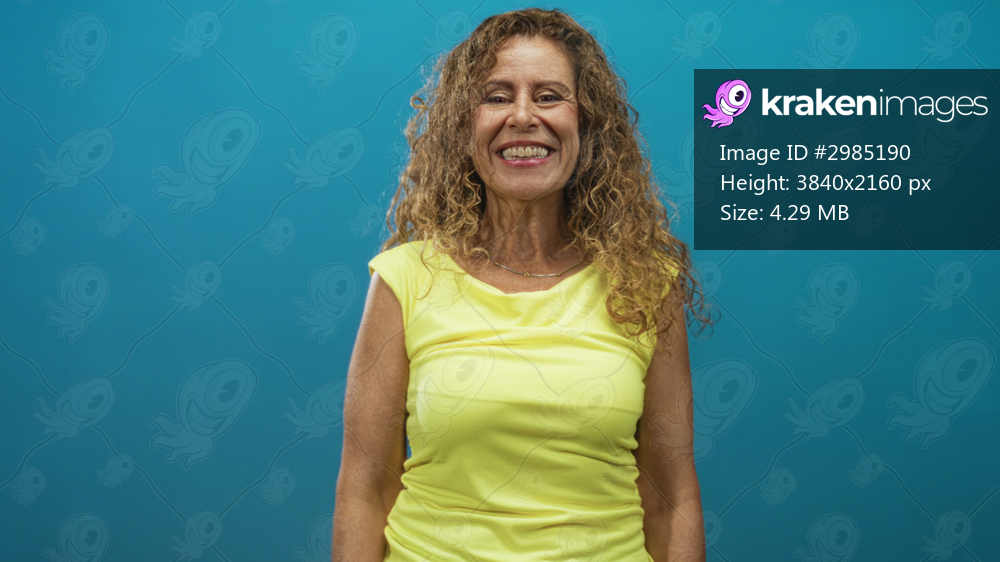 Woman points finger showing hand and forearm, wearing yellow tanktop and smiling at camera in studio; joy confidence.