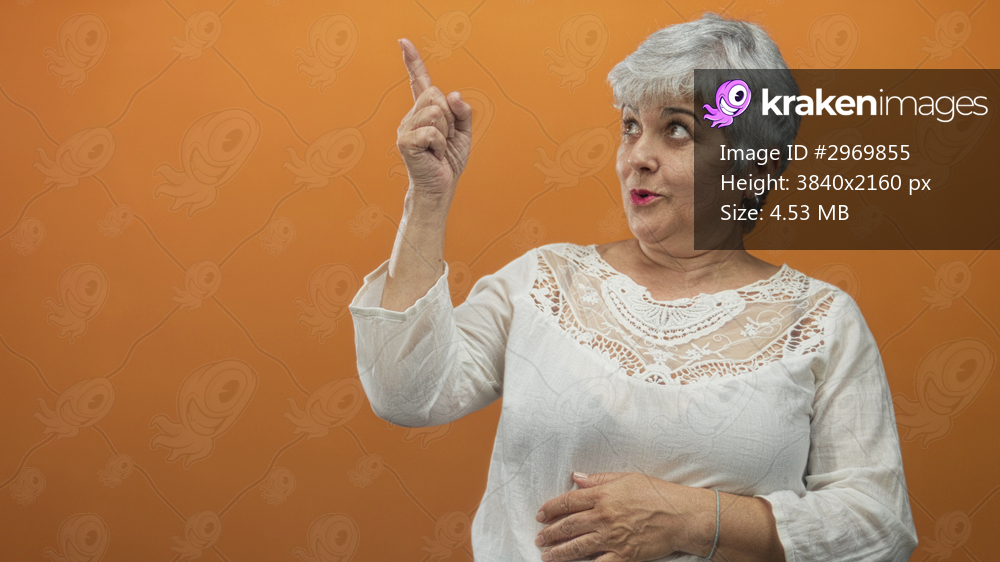 Woman points finger and smiles, hands visible, wearing lace blouse against orange studio wall; joyful warm confidence.