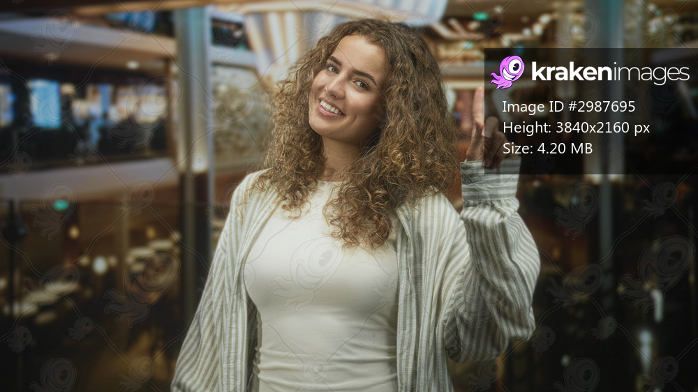 Woman points finger and smiles, showing hand and white shirt in a building interior; warm friendly confidence.