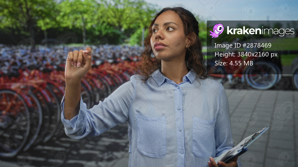 Woman points finger to a bike rack while holding a clipboard and gesturing to rental parking on a busy city street; determination.