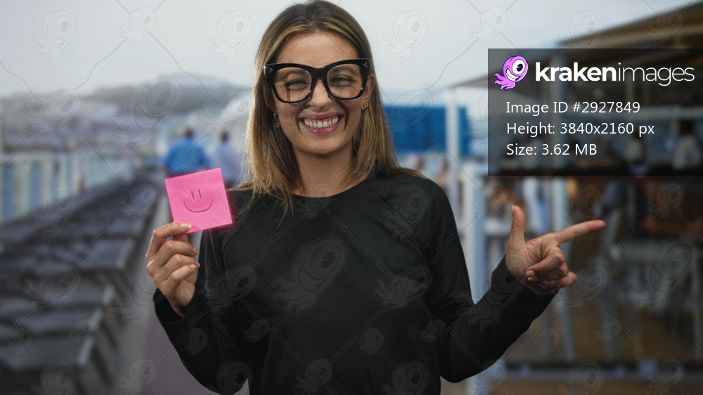 Woman points finger to a pink sticky note she holds while smiling on a cruise deck with railing and seats visible; optimism.