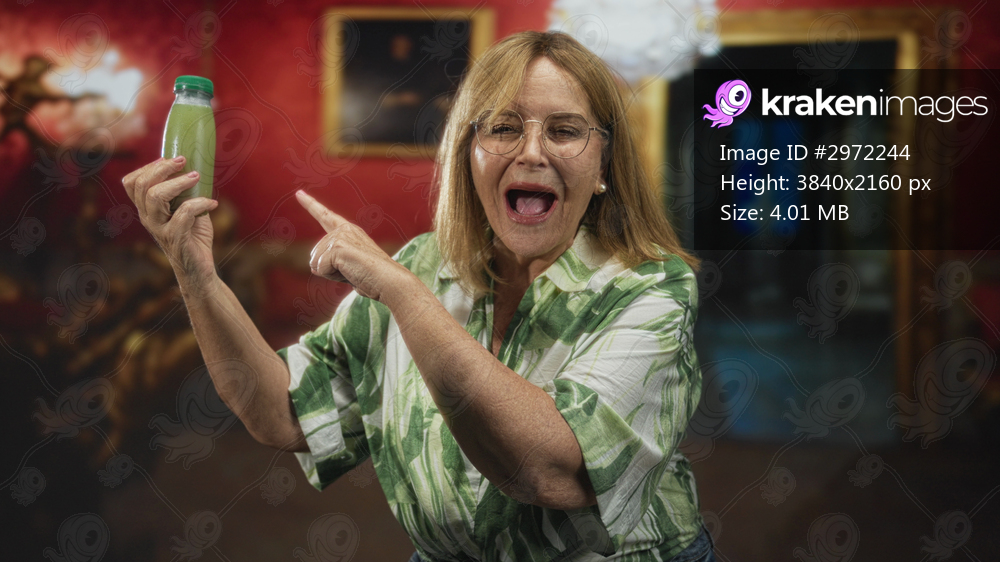Woman points finger to bottle of green juice while holding bottle and smiling with open mouth in ornate room inside building; wellness joy.