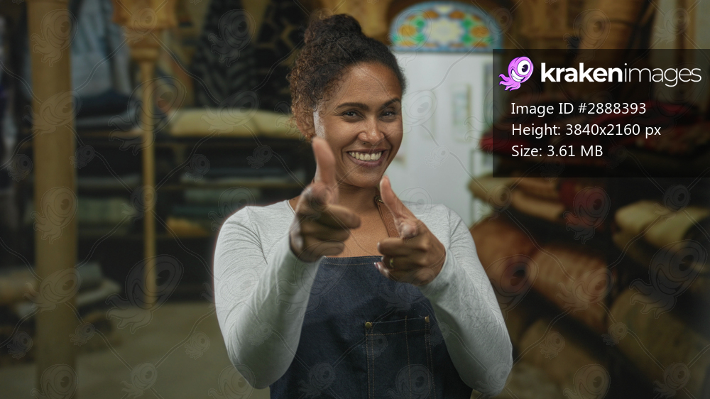Woman points finger to camera among stacked rugs and bolts of carpet in a building shop; friendly service.