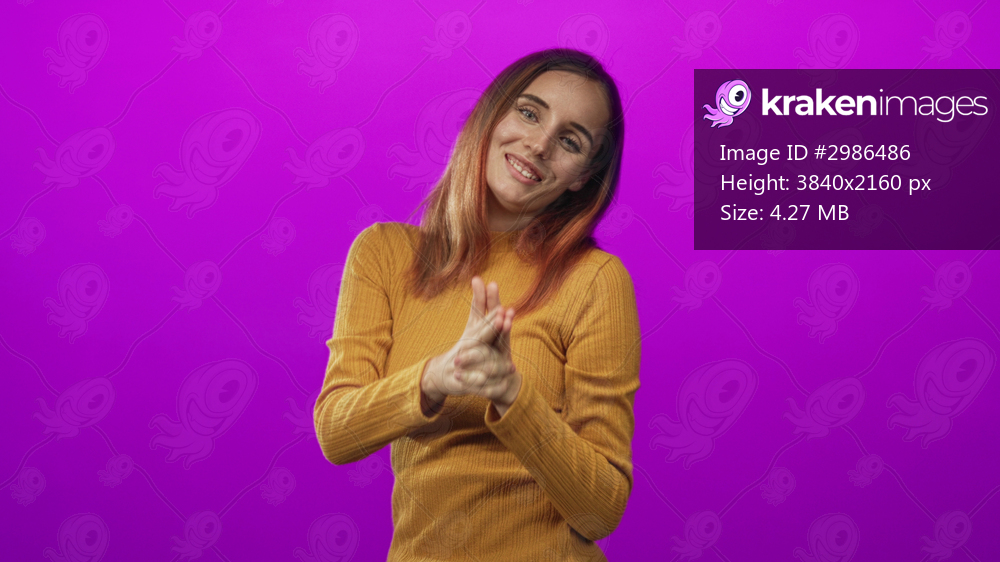 Woman points finger to camera with hands extended in mustard sweater against purple backdrop in studio; playful confidence.