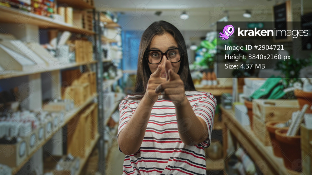 Woman points finger to camera with hands visible in building store interior; playful friendly encouragement.