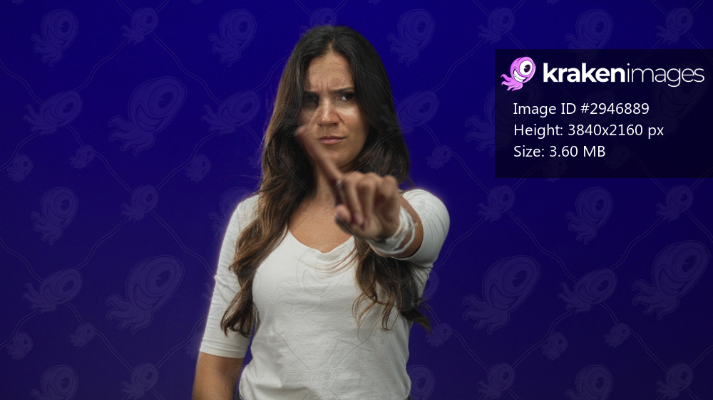 Woman points finger to camera in blue studio, wearing white tshirt and bracelets with brunette hair; firm disapproval.