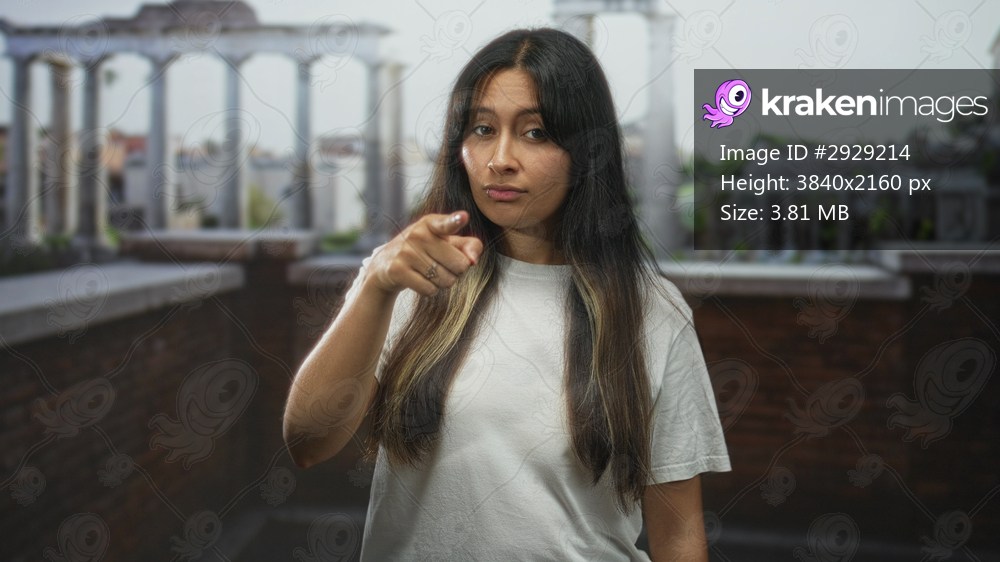 Woman points finger to camera in building at roman ruins wearing white t shirt and lip ring; defiance confrontation.