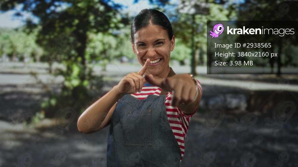 Woman points finger to camera in forest wearing denim apron and red striped shirt, smiling with bracelets and tied hair; playful confidence.