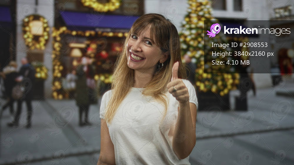 Woman points finger to camera on city street beside decorated storefront and large christmas tree; holiday joy.