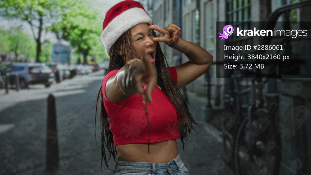 Woman points finger to camera on street wearing santa hat and red crop top showing midriff; holiday playful cheer.