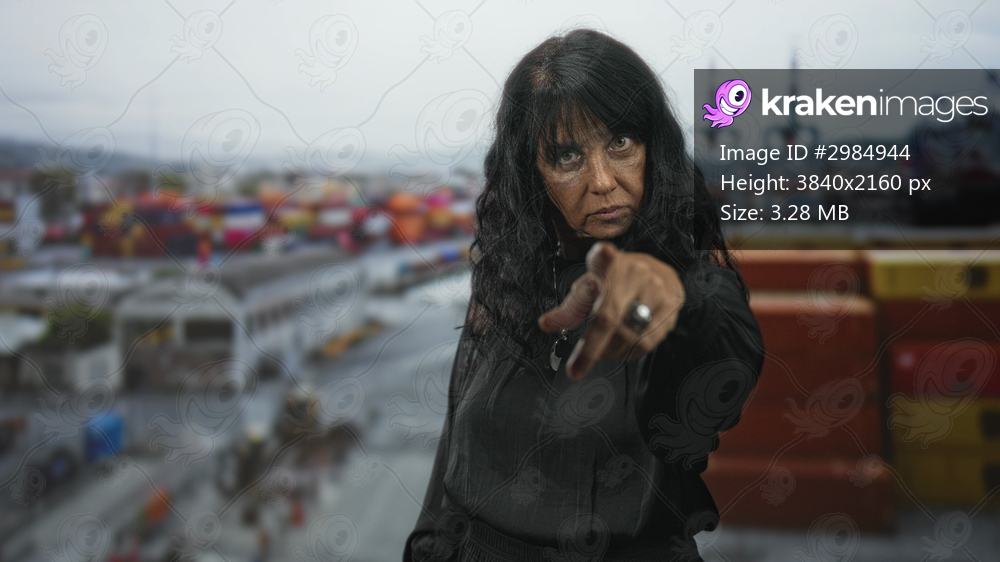 Woman points finger to camera showing ring and outstretched hand at shipping port with stacked containers; authority confrontation.
