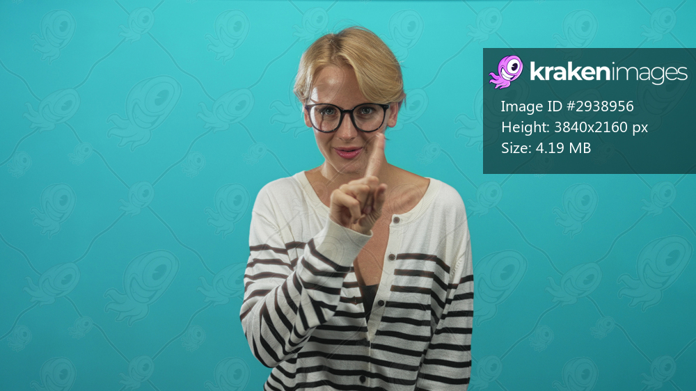 Woman points finger to camera wearing glasses and striped sweater against a turquoise studio backdrop; seriousness warning.