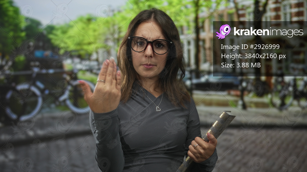 Woman points finger to camera while holding a rolled document and wearing glasses on street in amsterdam; confidence.
