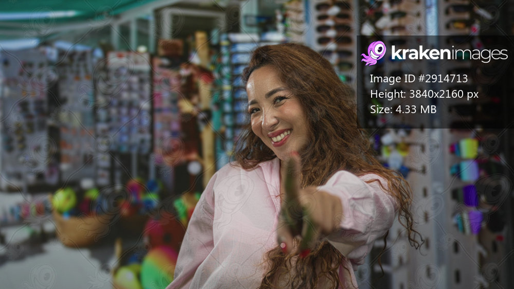 Woman points finger to camera while smiling in a crowded street market souvenir stall with sunglasses rack and baskets visible; playful confidence.