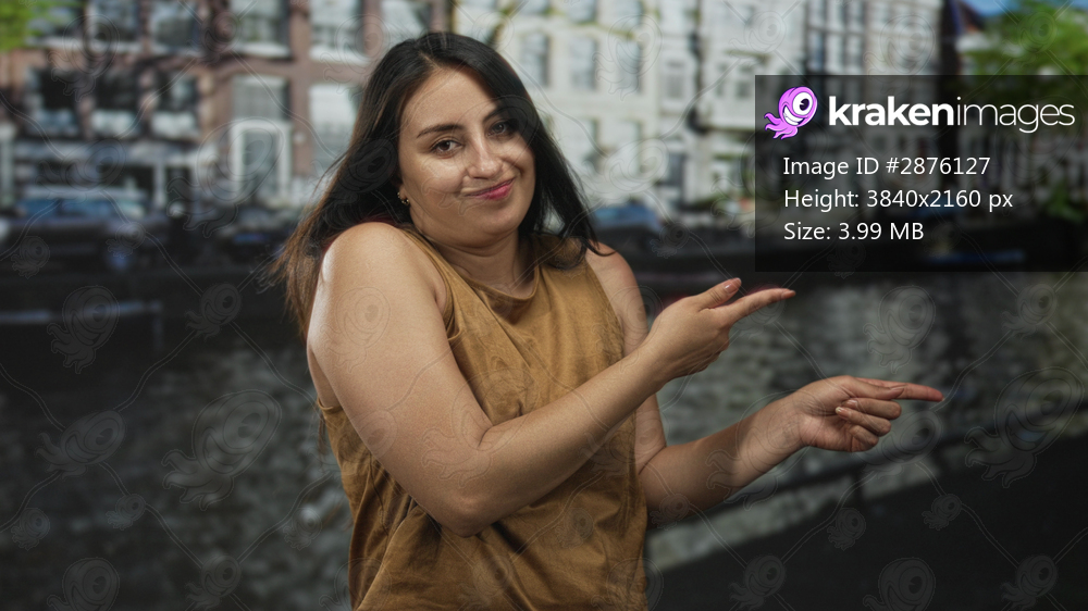 Woman points finger to canal on an amsterdam street with a smirk and shrugged shoulders; playful curiosity.