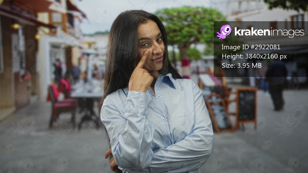 Woman points finger to cheek with arms crossed on a restaurant terrace near sidewalk tables, facing camera and smiling slightly; playful teasing confidence. - Kraken Images