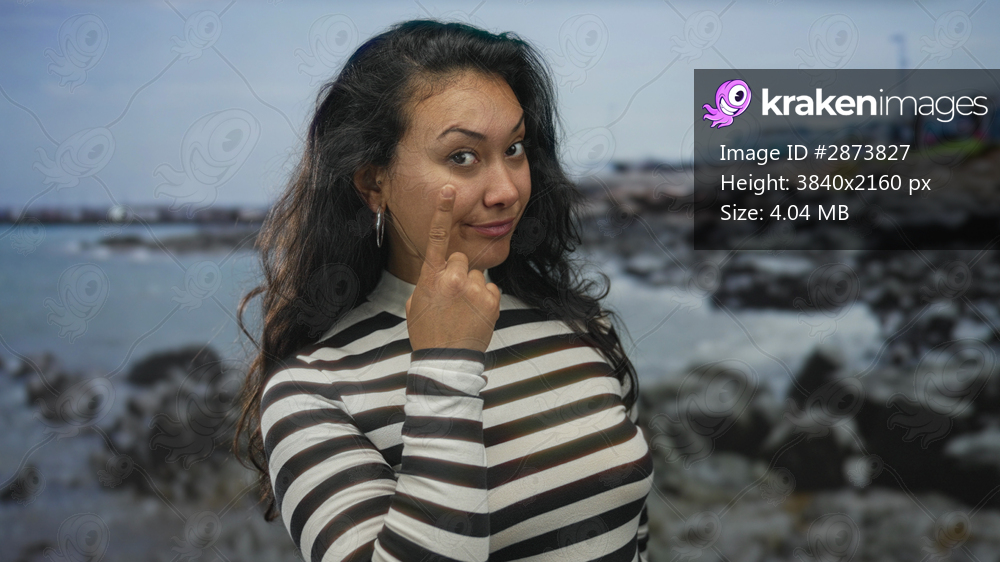 Woman points finger to cheek at rocky beach with striped top and hoop earring, direct gaze to camera; playful confidence.