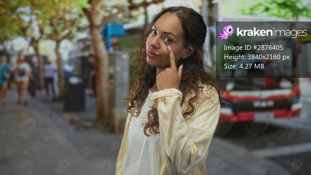 Woman points finger to cheek on street near a bus and trees, wearing striped shirt and white tee; urban confidence.
