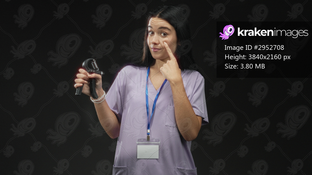 Woman points finger to cheek while holding a handgrip and wearing purple scrubs with lanyard badge in studio; instructional.