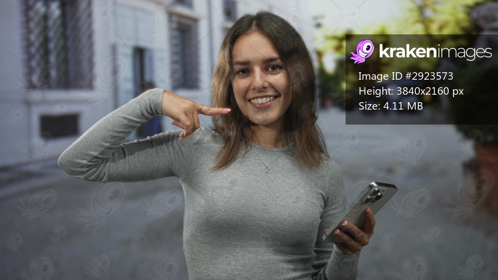 Woman points finger to cheek while holding smartphone on a busy street, smiling at camera; joy confidence.